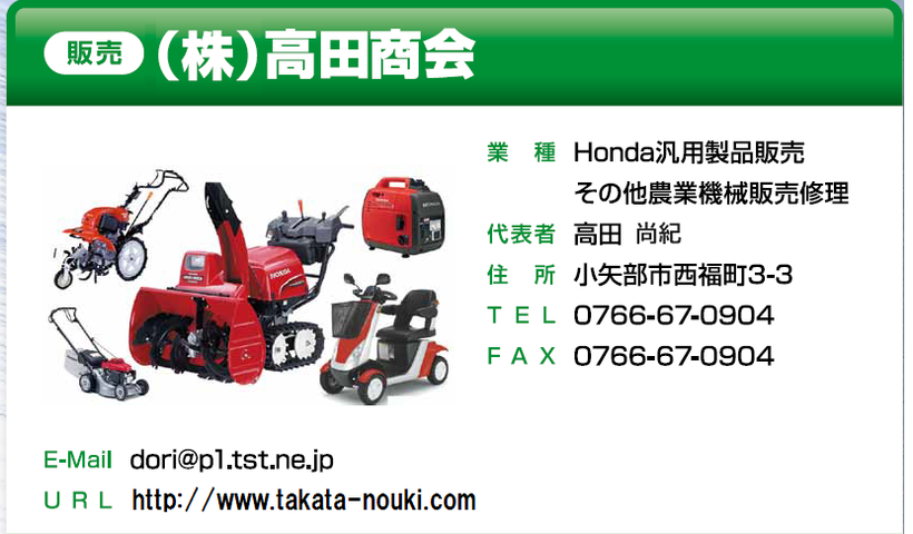 主要商品:ホンダパワープロダクツ・・汎用製品、耕運機、発電機、蓄電器、除雪機 アデクス㈱・・・運搬車 コロナ工業㈱・・24時間温水器、イオン水洗浄機 ゼノア㈱・・・・芝刈機 電動カート、歩行アシスト、刈払機、草刈り機、 船外機、汎用エンジン、ブロア 水ポンプ、動力噴霧器、高圧洗浄機、 |