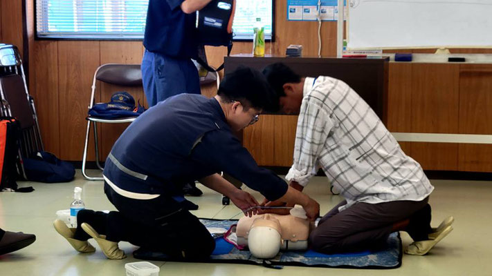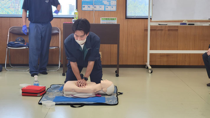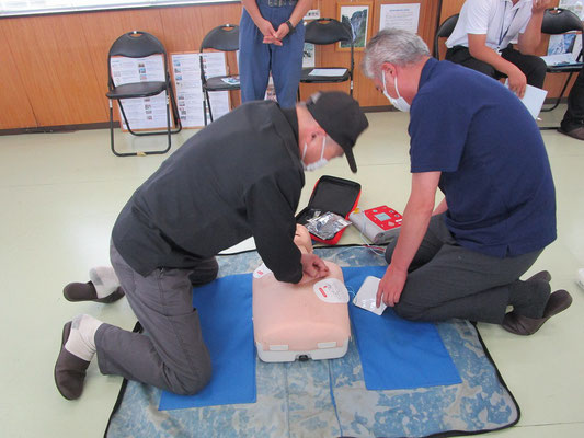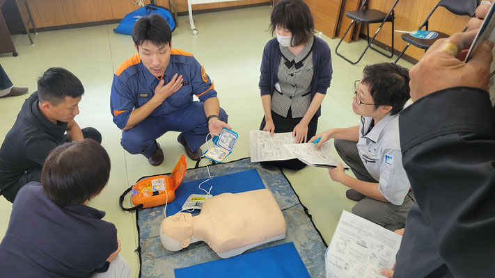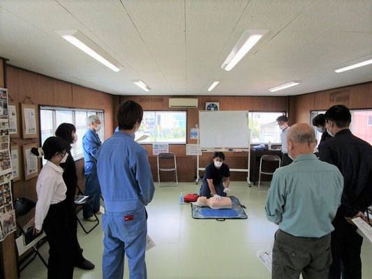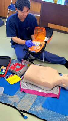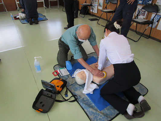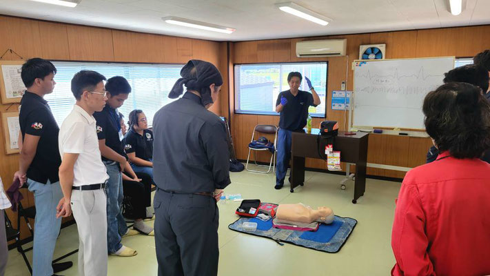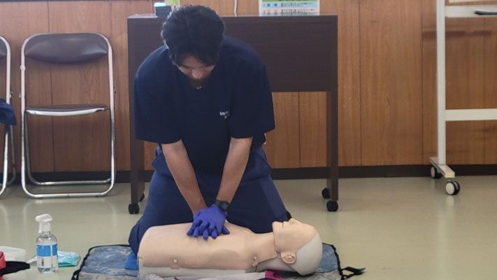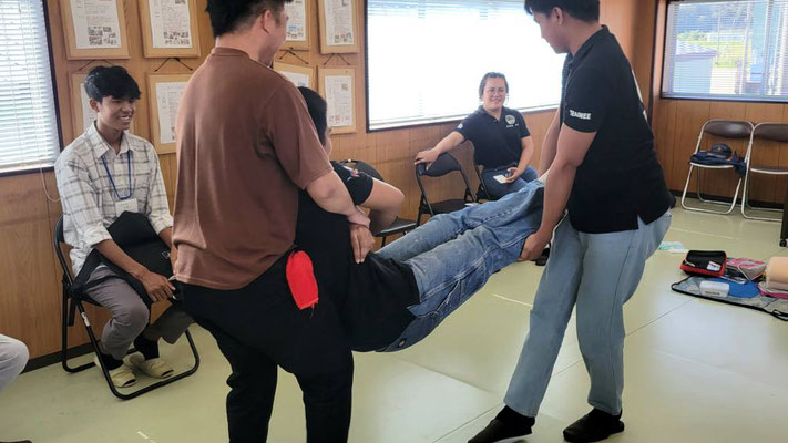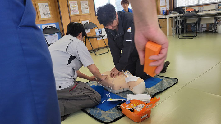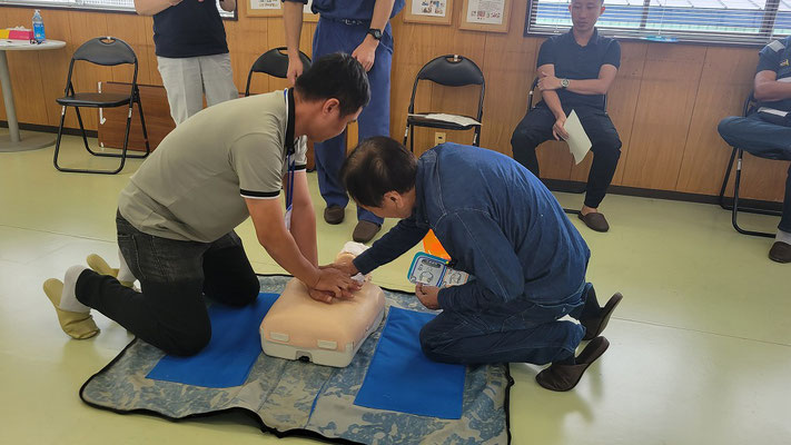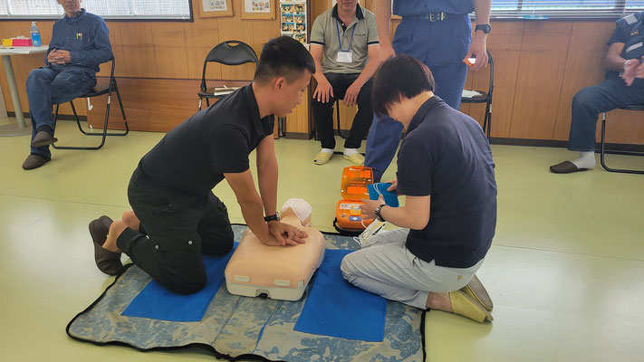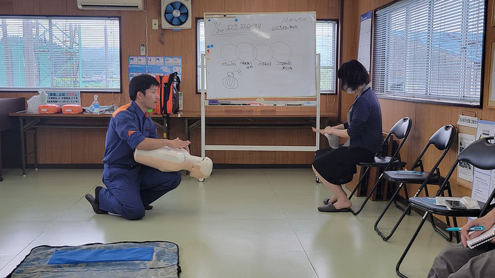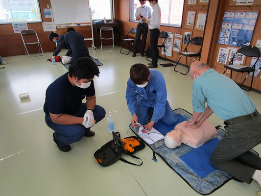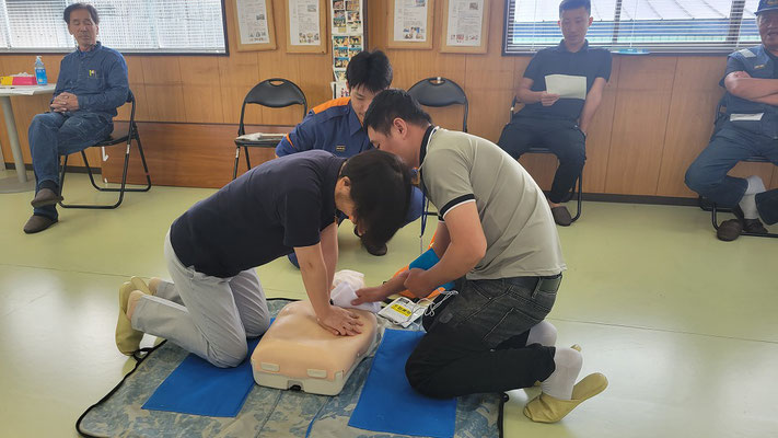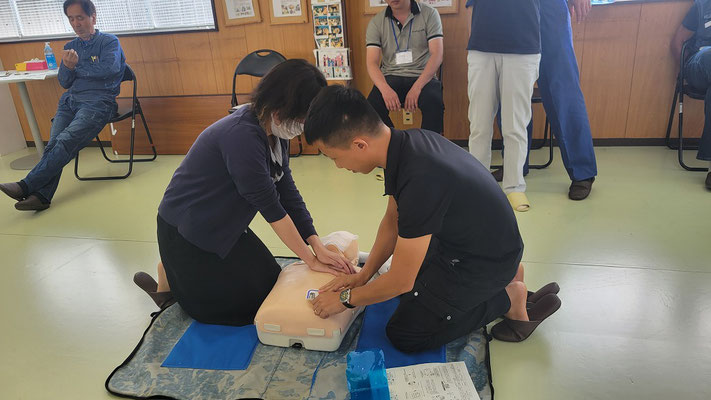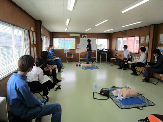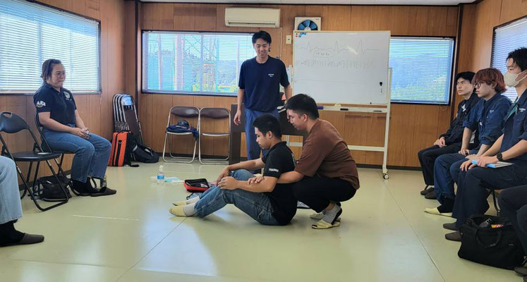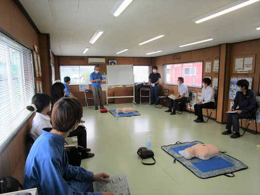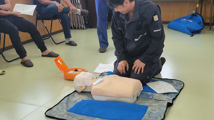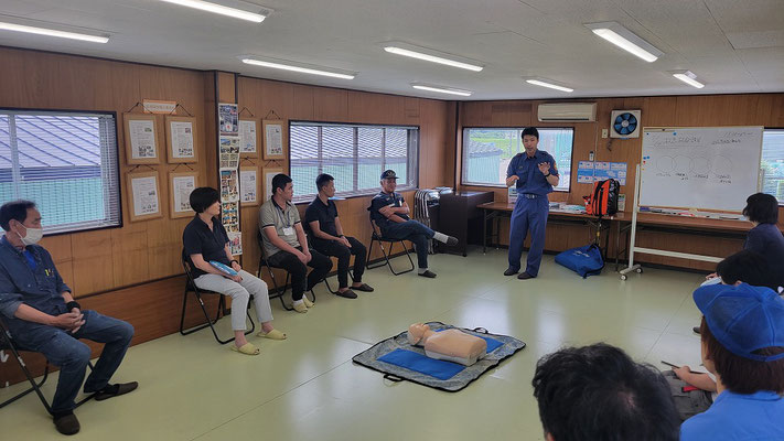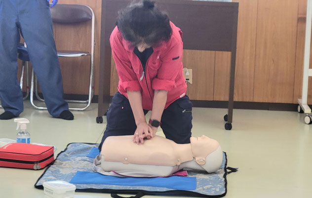 救急救命講習・AED操作講習・熱中症対策・止血法・緊急時の搬入法・脳梗塞などの対応見分け方・身近にある物での搬入・対策、備蓄その他、毎年少しづつテーマを変えながら訓練しています。